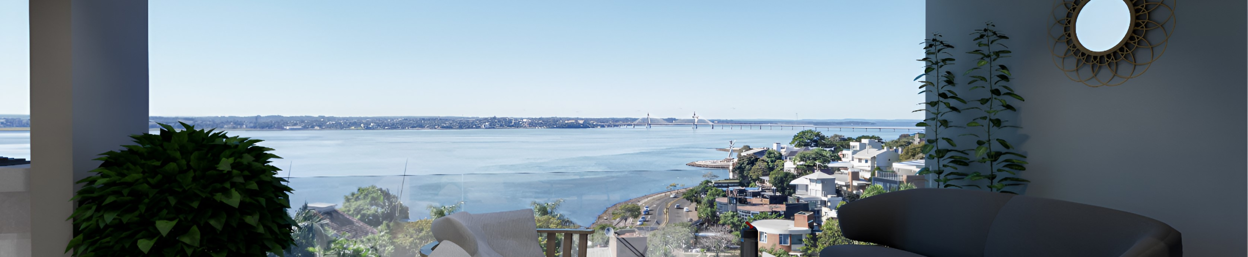 - Ingreso a hall y estar-comedor orientado hacia el contrafrente, con ventanales hacia el balcón y vistas al río.